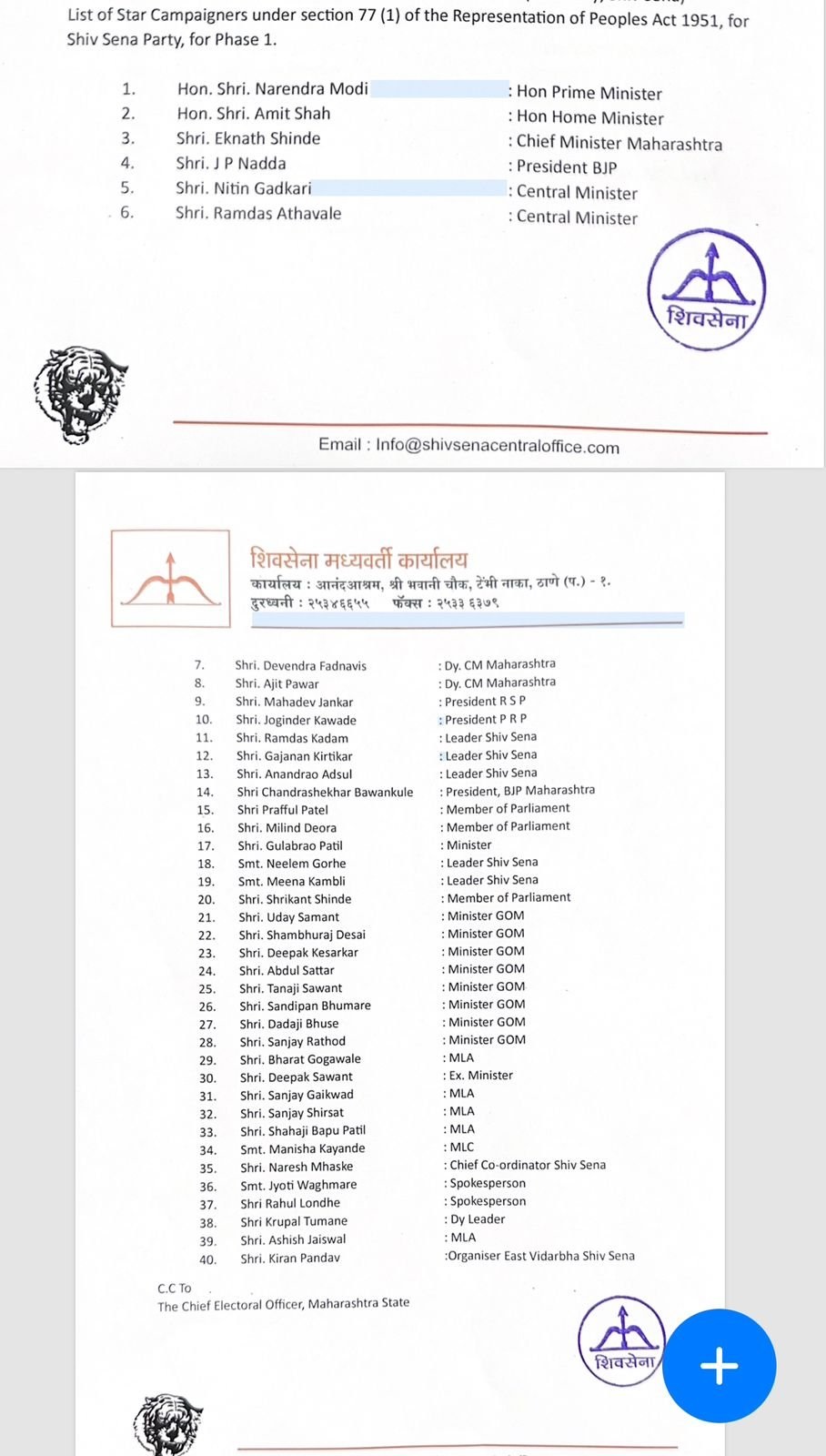 लोकसभा चुनाव 2024 के लिए सभी राजनीतिक दल लगातार अपने उम्मीदवारों और स्टार प्रचारक की लिस्ट जारी कर रही है। इसी शिवसेना ने भी 40 लोगों के स्टार प्रचारक की लिस्ट जारी की है।